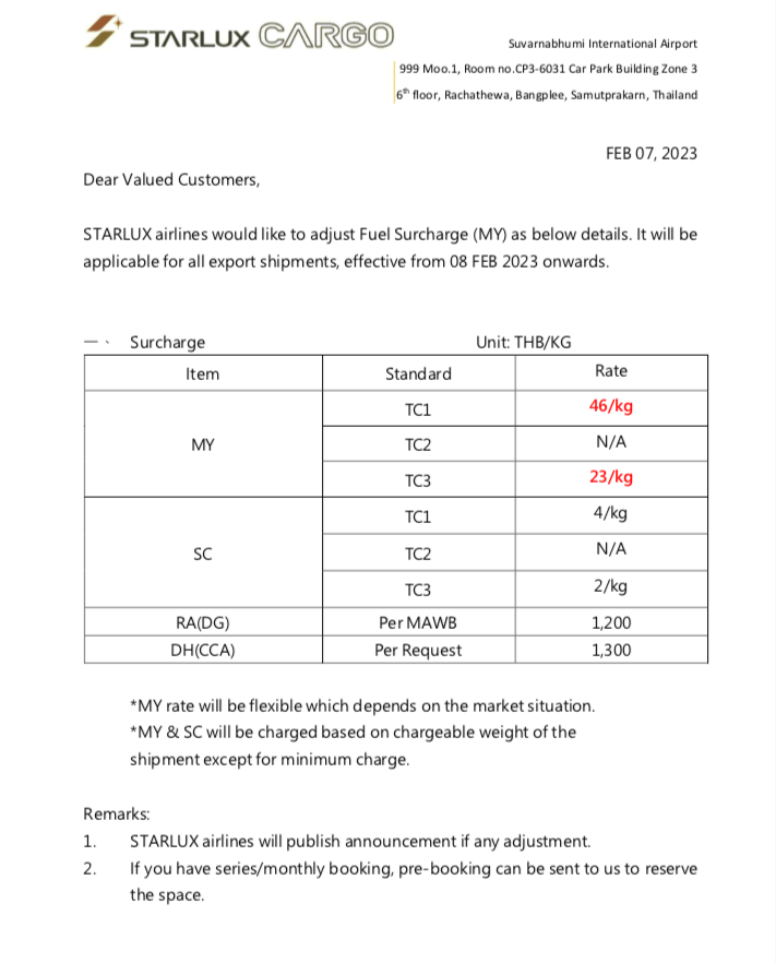JX FUEL : STARLUX Airlines : MY Fee Adjustment Announcement